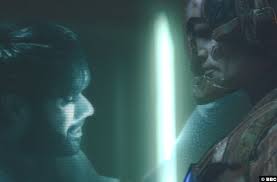 In the film, as a part of his Jedi training, Luke Skywalker descends into a cave steeped in the power of the dark side (essentially the Matrix on Gallifrey, as it could have been written). In it he sees a vision of his nemesis, Darth Vader, coming towards him. As they engage in a light saber duel, Luke gets the upper hand and decapitates Vader, only for his mask to explode revealing Luke’s own face underneath. This plants the seed in the audience’s head for the climactic scenes in Cloud City, when Vader, as everybody knows, reveals himself to be Luke’s father. In both scenes exposition comes out of drama. The story is moved forwards and Luke takes an active part in discovering that knowledge for himself. He earns his rite of passage.