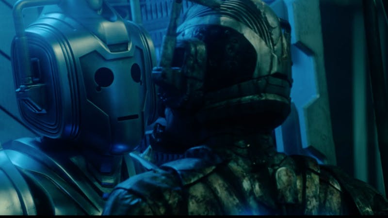 The Doctor reluctantly travels with the Master through the boundary to Gallifrey, just as the Cyber-carrier arrives on the planet. Arriving on Gallifrey, the Doctor once again gazes upon the ruined citadel of the capitol. Once inside, the Master reminisces with the Doctor about old times. A comedy alert sound on the Master’s phone (yes, really) announces the arrival of the Cyber-carrier. The Master Skypes with Ashad (Patrick O’Kane), offering him an alliance with the Cybermen on Gallifrey. He even sends Ashad a Google Maps-style link to the capitol (enable ‘boundary’ portal, disable tolls, motorways and ferries), promising to roll out the red carpet on their arrival. Ashad sends an execution squadron to hunt for Ko Sharmus and the others on the planet, whilst the remainder of his army plots a course for Gallifrey.